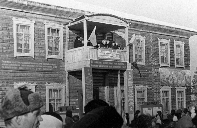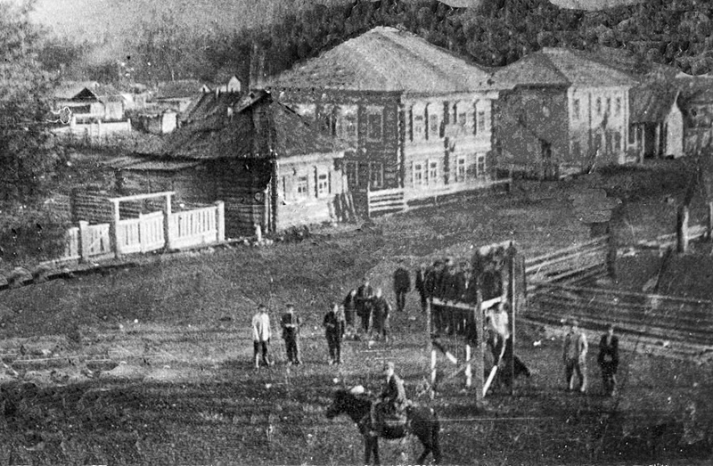 Турочак довоенный. На фото сохранившийся военкомат. В центре трибуна вождей. Из архива И.И. Казанцева